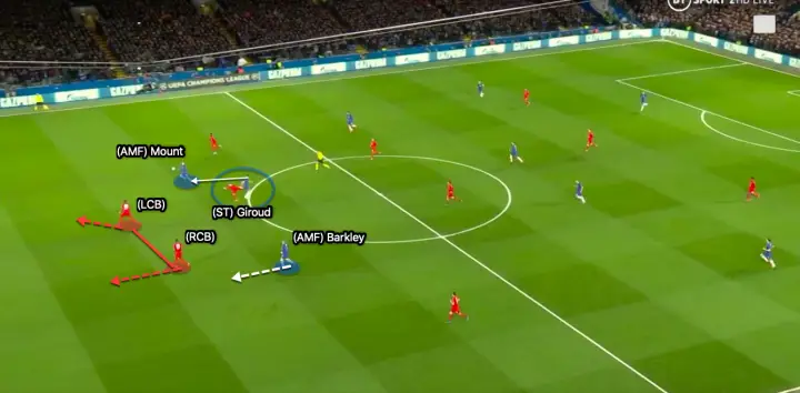 Giroud wins the aerial duel nodding it on for Mason Mount. Mount and Ross Barkley are now in a 2v2 against Bayern’s two centre backs, a very favourable position for them. However, they are unable to score from the situation because of the electric Alphonso Davies making a recovery run. The Canadian fullback made four ball recoveries in his own half.