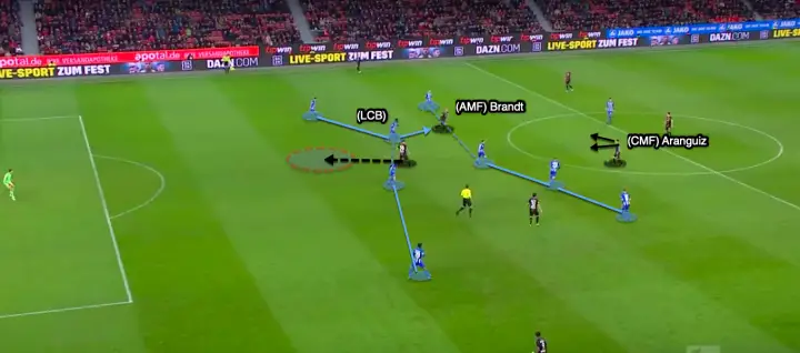 Below he is positioned to cause problems to Hertha Berlin’s high-line. The left centre-back moves to press Brandt who he anticipates will receive the ball. However, Havertz recognises the space this now opened up in-behind their defensive line and so does Aranguiz. This run by Havertz eliminates all 10 outfielders on the pitch and his pace leaves him 1v1 against the goalkeeper where he calmly chips him.