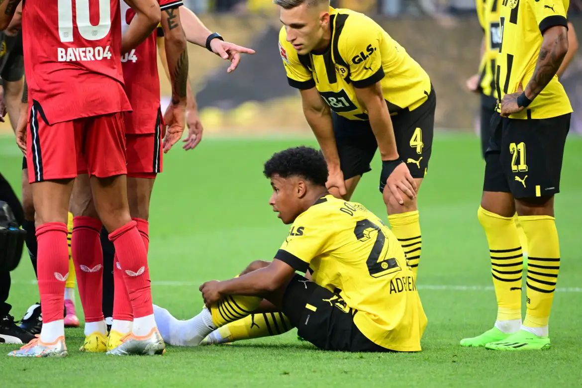 Karim Adeyemi’s Bundesliga debut for Borussia Dortmund was over after 23 minutes on Saturday evening. The German forward injured his foot after a duel with Bayer Leverkusen defender Piero Hincapié.